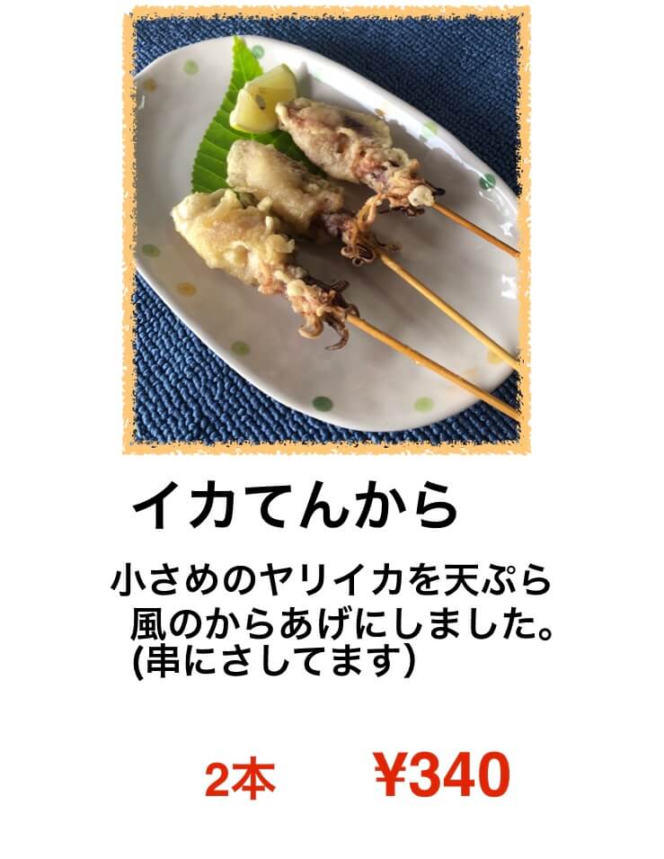 - 天ぷら風唐揚げ、"イカてんから"発売しております。小さめのやりイカを串に刺して揚げてみました。